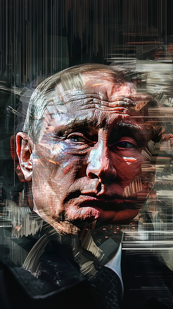 The Prerogatives of Power is a multi-screen installation that displays AI generated glitch portraits of political leaders from around the world (Putin, Trump, Zelensky, Xi Jinping, etc). The AI diffusion models result in portraits based on a fusion of many sources and the output images are fed backed into the AI image generator for multiple iterations producing the final result. This series is a critique and warning of the use and abuse of power by authoritarians the world over. The Prerogatives of Power is inspired by Antonio Muntadas’ 1987 installation “The Board Room” and by portrait studies by Frances Bacon.